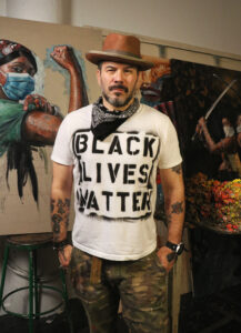 Tim Okamura investigates identity, the urban environment, metaphor, and cultural iconography through a unique method of painting – one that combines an essentially ‘realist’ approach to the figure with collage, spray paint and mixed media. The juxtaposition of the rawness and urgency of street art and academic ideals has created a visual language that acknowledges a traditional form of story-telling through portraiture, while infusing the work with resonant contemporary motifs.