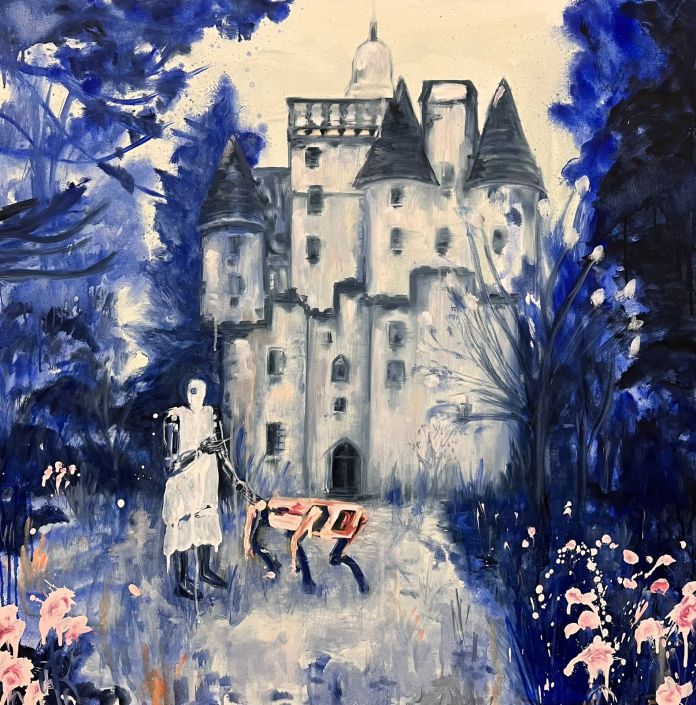 Playing with perspective, her paintings depict disproportionate figures or things that are in dialogue with the multidimensional environments. Rendering parts of the work differently serves as a means to distinguish rhythm, stillness, force and sensitivity. Stillness and time are necessary to reveal parts of the enigmatic scenes.