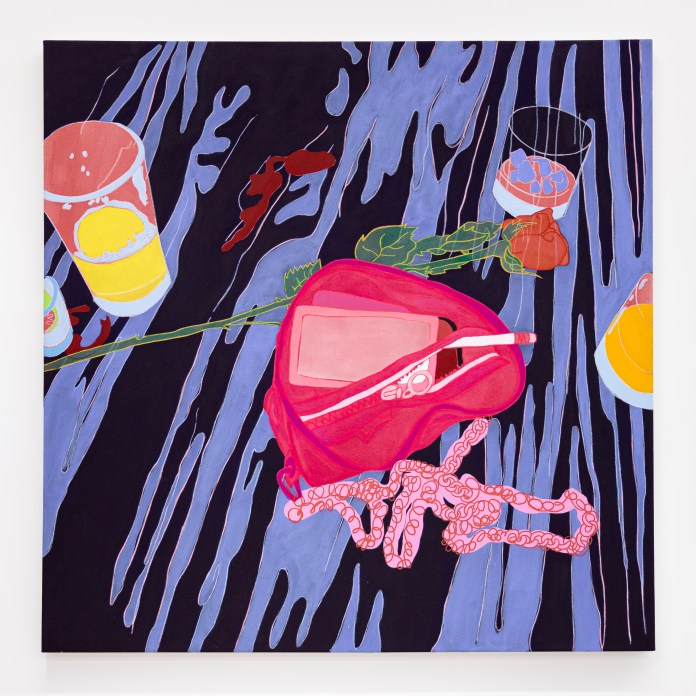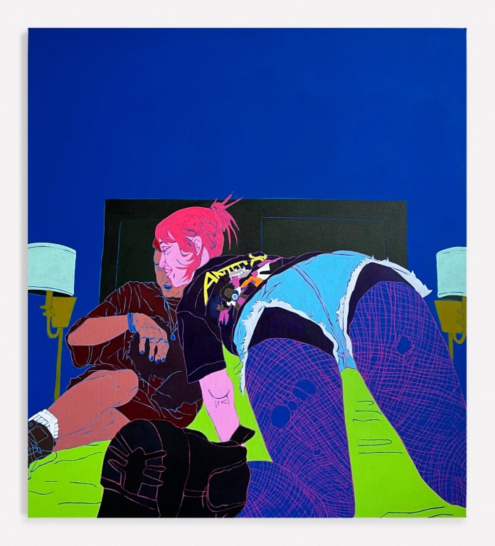 DIMIN is excited to present Devoraste, a neon diary of the vivid exploits of Destiny Haven Trujillo. For her first solo exhibition in New York, Trujillo embodies the manic charm of her daily life, offering a voyeuristic glimpse into the contemporary vie boheme. The title of the show, “Devoraste”, is derived from the Spanish aphorism meant to convey the concept of unabashed queer self-expression, with the literal translation “you ate that!”. For Trujillo, devoraste references the celebration of pride she conveys in her paintings –colorful bacchanals teeming with joy.