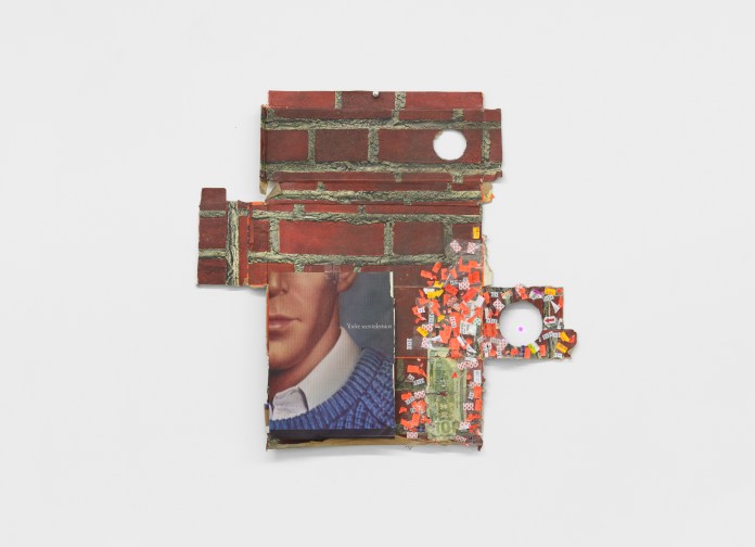Elzie Williams III That’s Hot, but you’re Fired!, 2023 cardboard, magazine page, counterfeit bill, stickers, clear tape, laser pointer 24 x 23.5 inches (61 x 60 cm)