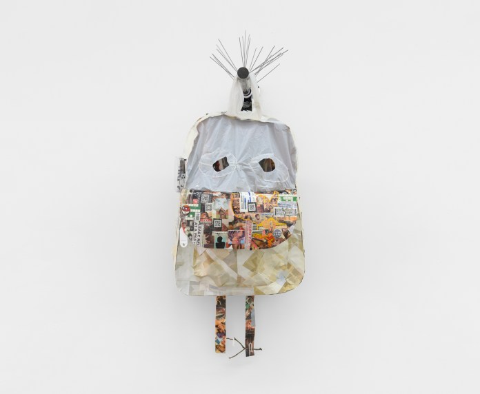Elzie Williams III Do You Know Where You’re Going To?, 2023 magazine swatches of black and brown faces with the color white on reverse, found images, plastic, found objects, acrylic rod, metal, flagpole bracket, light 33 x 14 x 12 inches (84 x 36 x 31 cm)