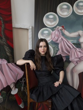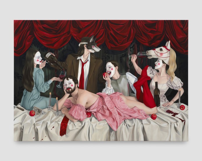 Jeanine Brito (b. 1993, Germany) is a painter living and working in Montréal, Canada. Layered in theatrical and fairy tale imagery, she uses her likeness to play with ideas of gender and desire. Her paintings have permeated the cultural consciousness, appearing in Harris Reed’s debut runway collection for Nina Ricci, on an album cover by Clara Luciani, on the cover of the highly reviewed debut novel by Sophie Kemp, and many other crossover collaborations.Recent exhibitions include All the Better to Eat You With, Nicodim, Los Angeles (2025), The Amber of This Moment, Nicodim, Bucharest (2025), The Grumpy Girls, Nicodim, New York (2024), The Invitation: A Fairytale by Jeanine Brito, Nicodim Upstairs, Los Angeles (2023), So Softly and Sweetly, La Causa Galeria, Madrid (2022), You Me Me You curated by Rachel Keller, Nicodim, Los Angeles (2022), New Mythologies II, Huxley Parlour, London (2022).