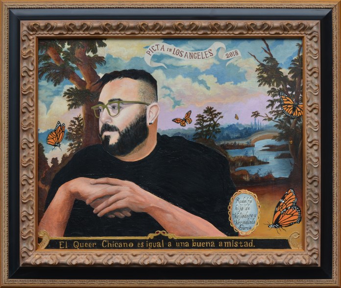 A native Angeleno, he attended Immaculate Heart College and lists influences as diverse as Pop Art, Corita Kent, David Hockney, Mexican retablos, and 20th-century painters ranging from Romaine Brooks to Frida Kahlo. His work conveys the energy, politics and creative synergy of Chicano and queer art circles in Los Angeles.