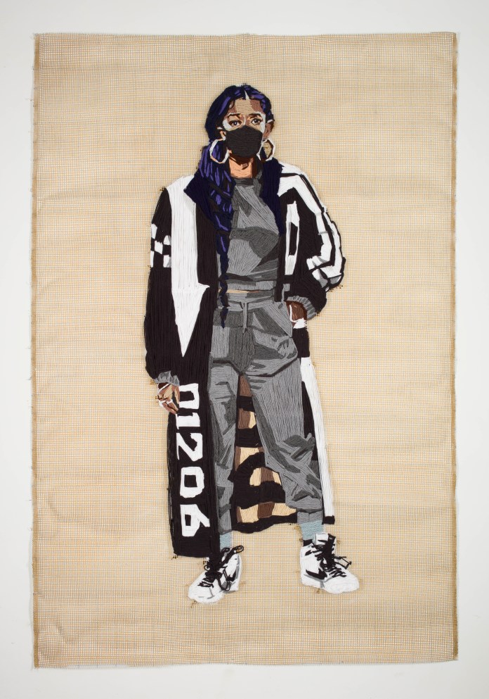 Br00klynBetty, 2021 Yarn and spray paint on plastic canvas, 90 x 60 in. Courtesy the artist and ACA Galleries, New York