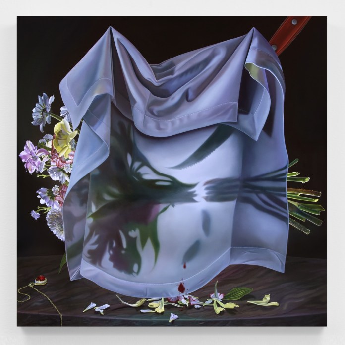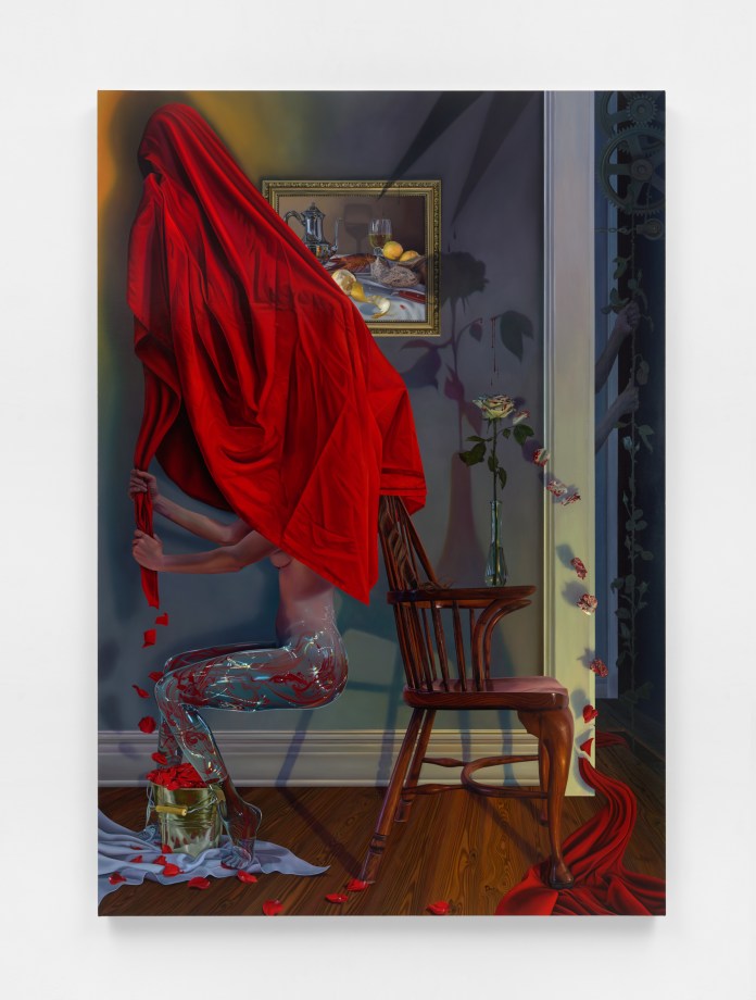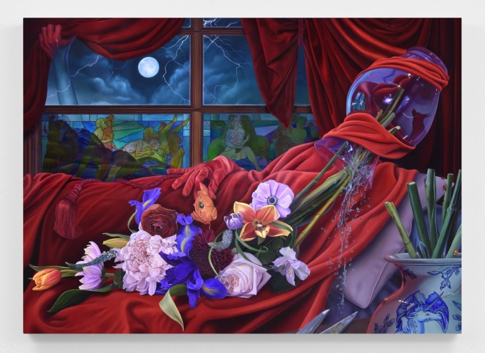 Marisa Adesman’s surreal and thought-provoking paintings often depict ordinary objects in bizarre contexts and striking states of mystical transformation. She composes tableware, candles, houseplants, flowers, linens, kitchen utensils, and furniture into strange and unusual arrangements that destabilize our notions about the proper order of a house and home. These settings are often centered around the female form and are guided by Adesman’s visionary poetics of interior space. She examines the art historical meaning of the female figure as a pliable body designed for amorous desire and protection, but also sinister and capable of deception and corruption. Adesman’s compositions mingle ethereal and phantasmagoric imagery of the surrealist period with Dutch still life and vanitas paintings from 16th and 17th century Europe. Likewise, she retains all the attendant technical mastery which defined those artistic styles. Smooth and luminous surfaces combined with a masterful use of chiaroscuro, the skillful contrastingof extreme light and dark, reveals the hand of a remarkably detailed painter whose work demands to be viewed in person.