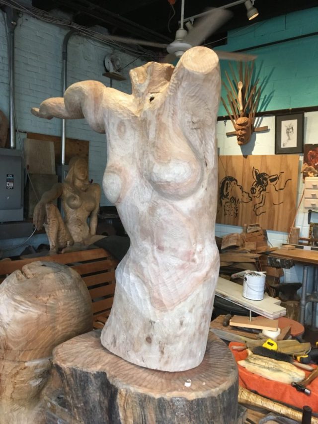 As well as carving wood, his primary medium, Wing has travelled the world carving ice, snow and sand. Among the most influential experiences of Wing’s life were five weeks spent in Japan studying Buddhist and traditional wood carvings and two summers learning to carve marble in the studio of Manuel Neri, in Carrara, Italy. Wing’s family, home and studio are in West Philadelphia where he is part of a vibrant arts community.
