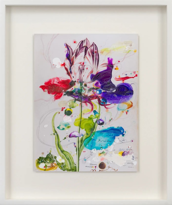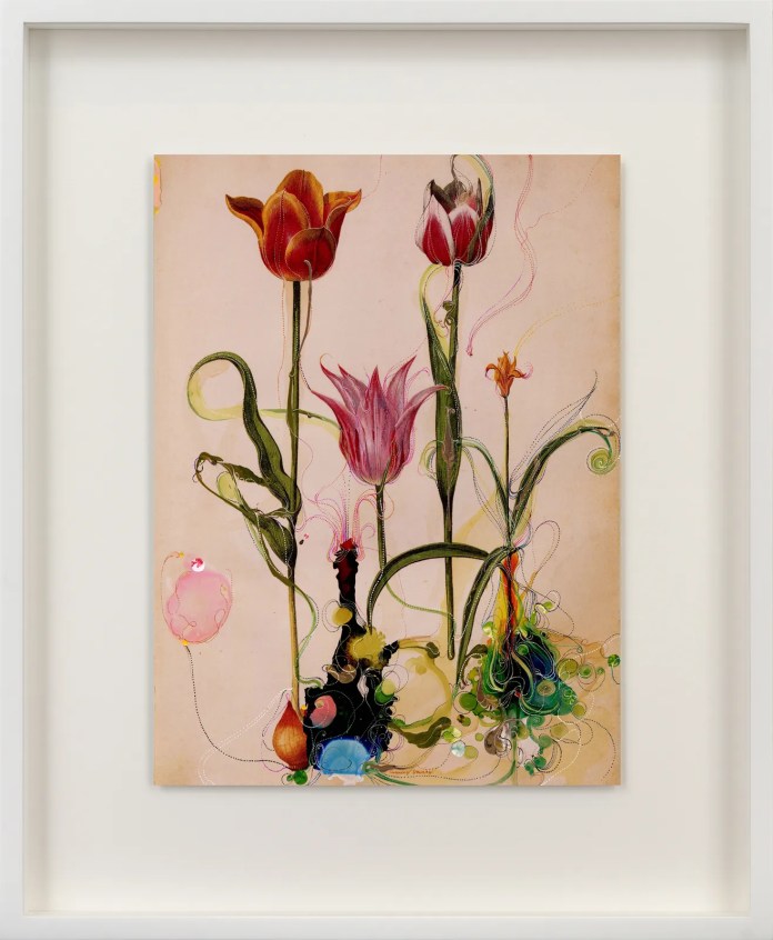 He maintains an extensive archive of images, ranging from intimate family photographs to pages sourced from historical flower books, particularly those rooted in the Dutch tradition of floriculture. Carefully sorting through this material, Bremer selects images that resonate with his memory, using them as the groundwork for each piece. His recurring engagement with floral imagery—tulips, roses, irises, and other blooms—places his work in dialogue with a long lineage of Dutch still life painting, while simultaneously reconfiguring it through a contemporary, psychological lens.